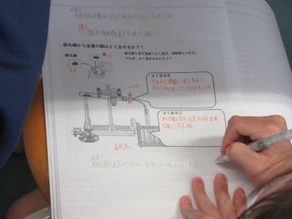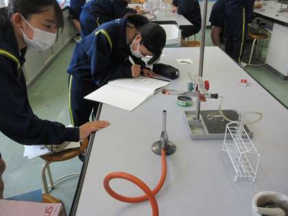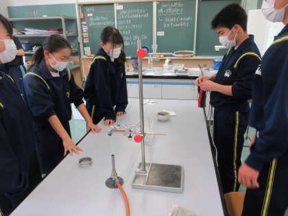 5月23日(月)授業の様子(2年4組理科) 公開日 2022/05/23 更新日 2022/05/23 今日の西中 2年4組は、理科で化学変化について学んでいます。金属の酸化物から金属を取り出すことはできるかを課題に、実験を行いました。酸化銅に炭を混ぜ加熱し、発生した気体及び残った物質について調べました。石灰水が白く濁り、金属光沢のある物質を取り出すことができました。