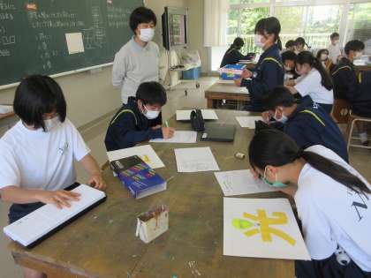 5月23日(月)授業の様子(1年1組美術) 公開日 2022/05/23 更新日 2022/05/23 今日の西中 1年1組は美術で絵文字に取り組んでいます。文字の意味を見る人に分かりやすく伝える工夫を考えながら、下書きを行っています。タブレットPCでイメージするイラストと文字を調べ、オリジナルの絵文字を創り出していました。