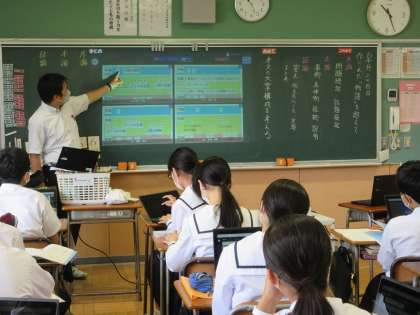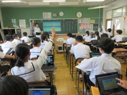 5月24日(火)授業の様子(3年1組国語) 公開日 2022/05/24 更新日 2022/05/24 今日の西中 3年1組は、国語で「作られた『物語』を超えて」という題材で読解を行っています。概要をひととおり理解したところで、本文の文章構成を考えました。段落ごとに、序論・本論・結論のどこに該当するか、タブレットPCを用いて意見交流を行いました。