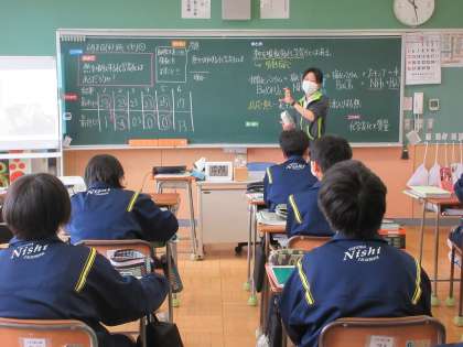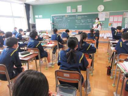 2年3組は、理科で化学変化について学んでいます。前時は、発熱する化学変化について、実験で確認しました。今日は、熱を吸収する化学変化はあるか考えました。映像資料を用いて、様々な化学変化の様子を観察しながら、化学変化による熱の出入りについて理解を深めていました。