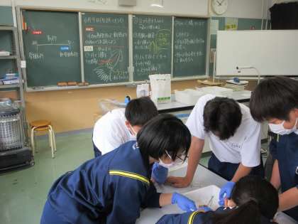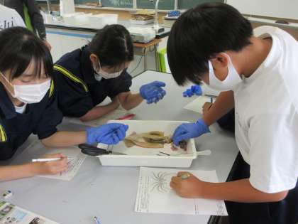 6月 9日(木)授業の様子(1年2組理科) 公開日 2022/06/10 更新日 2022/06/10 今日の西中 1年2組は、理科で動物のからだのつくりについて学んでいます。これまでは、セキツイ動物について学習を行ってきました。今日から、無セキツイ動物についての学習に入りました。イカの解剖を行い、軟体動物のからだのつくりを調べました。