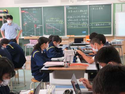6月 9日(木)授業の様子(3年2組理科) 公開日 2022/06/10 更新日 2022/06/10 今日の西中 3年2組は、理科で運動とエネルギーについて学んでいます。これまで、運動エネルギーと位置エネルギーについて、実験を通して理解を深めてきました。今日は、振り子の運動を例に運動エネルギーと位置エネルギーの関係を考えました。タブレットPCに、各自、考えをまとめました。
