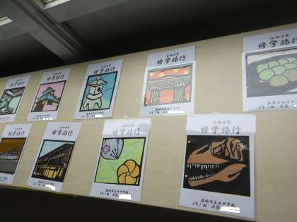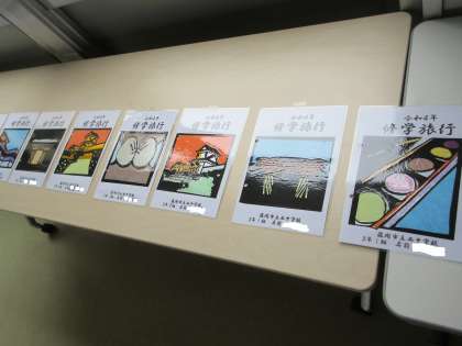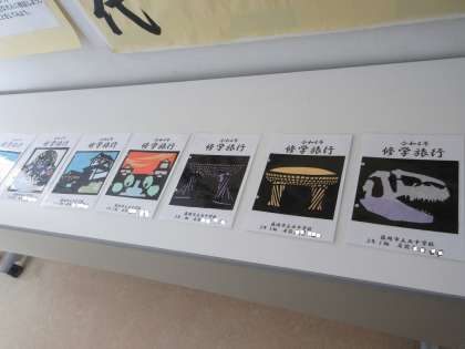 6月21日(火)修学旅行ノート表紙絵〜切り絵〜(3年1組) 公開日 2022/06/21 更新日 2022/06/21 今日の西中 3年生が美術の授業で作成した、修学旅行ノートの表紙絵が玄関前に展示されています。旅行先である北陸の名所を切り絵で表現しました。修学旅行先が素敵に表現されています。
