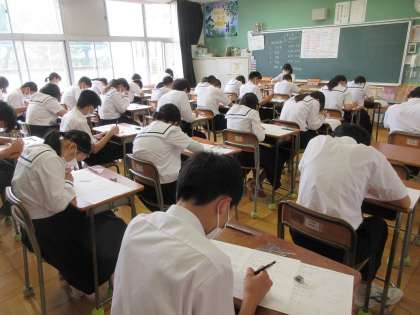 期末テスト2日目、音楽、理科、英語のテストがありました。写真は、理科のテストの様子です。