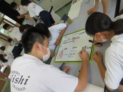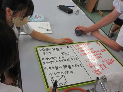 6月24日(金)授業の様子(2年4組理科) 公開日 2022/06/24 更新日 2022/06/24 今日の西中 2年4組は、理科で化学変化について学んでいます。今日は、金属を熱すると質量はどのようになるか、班で予想し、意見交流を行いました。多くの生徒が、既習事項から根拠を示して、しっかり説明することができました。