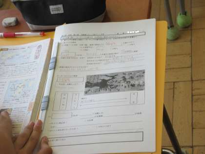 2年2組は、社会で中世ヨーロッパの世界進出について学んでいます。鉄砲伝来や南蛮貿易により、日本がどのように変わっていったか、資料を見ながら整理していきました。
