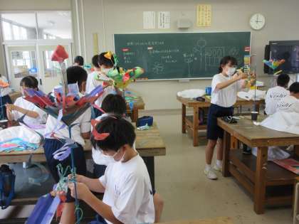 1年3組は「世界にひとつだけの花」という題材で、自分だけのオリジナルの花を紙で作っています。デザイン、模様、色の組み合わせ等々、様々な工夫を凝らして、素敵なオリジナルフラワーが完成しました。