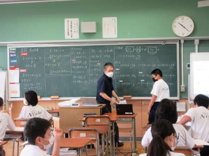 7月12日(火)授業の様子(1年1組数学) 公開日 2022/07/12 更新日 2022/07/12 今日の西中 1年1組は、数学で文字式を使った計算を学んでいます。今日は、共通の項をまとめ、式をわかりやすくすることを学習しました。積極的に課題にチャレンジしています。