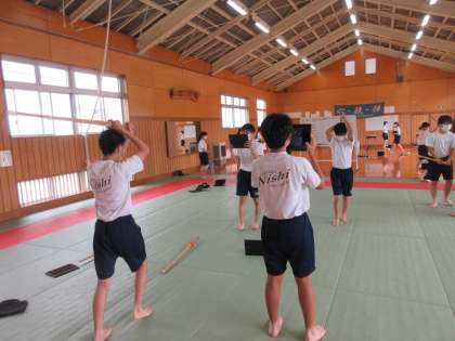7月13日(水)授業の様子(2年2組保健体育) 公開日 2022/07/13 更新日 2022/07/13 今日の西中 2年2組は、保健体育で剣道を学んでいます。今日は、前進後退正面素振りの練習を行いました。単純な素振りですが、剣道の基本が最も多く詰まっている素振りです。タブレットPCに素振りの様子を録画して、動作の確認を行いながら繰り返し練習を行っていました。