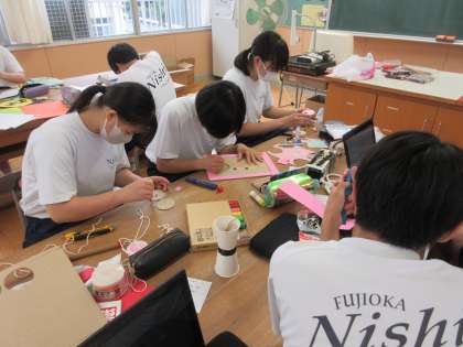 7月14日(木)授業の様子(3年3組家庭科) 公開日 2022/07/14 更新日 2022/07/14 今日の西中 3年3組は、家庭科で幼児の発達について学んでいます。これまでは、幼児にとっての遊びの意義や幼児との関わり方について学習してきました。今日は、幼児の遊び道具である、おもちゃを作りました。子ども達が、喜びそうな楽しいおもちゃが、たくさん完成していました。