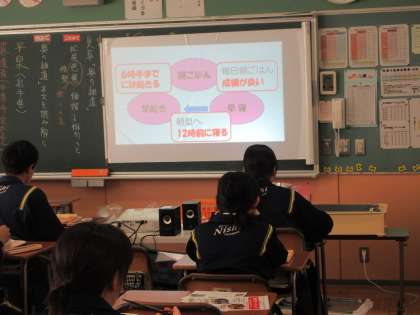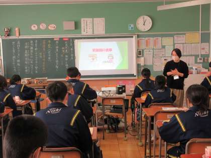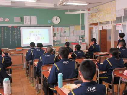 11月18日(金)栄養士さんの給食訪問指導(3年生) 公開日 2022/11/18 更新日 2022/11/18 今日の西中 現在、学校給食センターの栄養士さんが給食時に来校し、3年生に食に関する指導をしています。今日は、3年2組の生徒に指導していただきました。これから受験に向かう3年生が、入試で力を発揮するために、どのような生活や食生活をすればよいか、映像資料で丁寧に説明していただきました。3年生には、しっかり栄養を摂り、体調万全にして入試を乗り切ってほしいと思います。