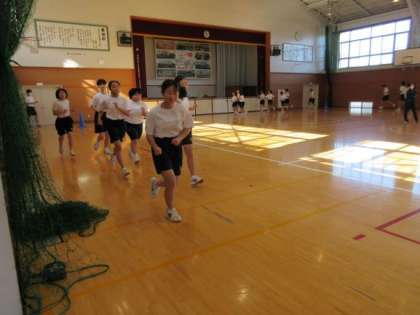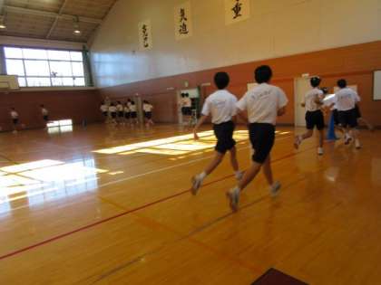 昨日の雨で校庭が使えないため、体育館で20分間走の練習をしました。混雑を避けるために四隅に分かれスタートです。