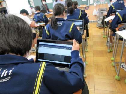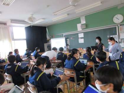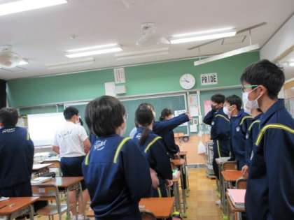 最初は復習で、どこの国に行きたいのか、ペアでSmall Talk。次に今日の中心、比較級について学習しました。5つの国の面積を比べ、○○国は△△国より大きいか小さいかを英文で表現できるようにします。やり方を理解したところで、先生が出した問題に取り組みました。まだ習っていない英単語(形容詞)もありましたが、教科書を見ながら頑張って問題文を解いていました。