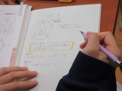 円の性質について学習をしています。円周角の定理に基づいて、円にできる角の大きさを求めました。