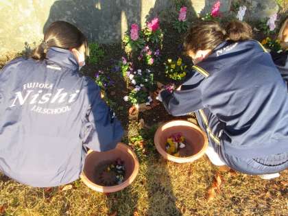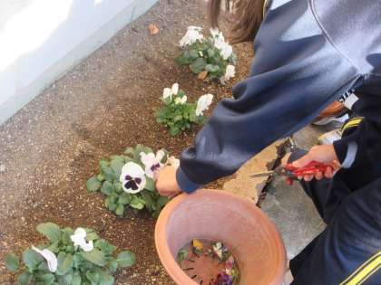 12月14日(水)園芸委員会の活動 公開日 2022/12/14 更新日 2022/12/14 今日の西中 寒い朝ですが、2年4組の園芸委員が、ビオラの花がら摘みを行いました。園芸委員の生徒がしっかり管理しているので、しばらくの間、綺麗な花が見られることかと思います。