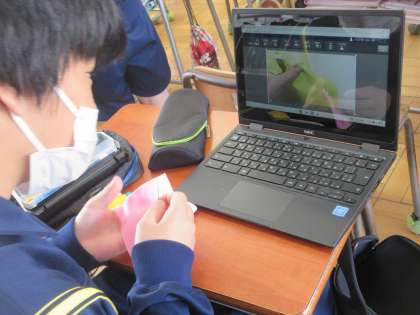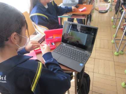 12月14日(水)授業の様子(1年1組家庭科) 公開日 2022/12/14 更新日 2022/12/14 今日の西中 ボタン、スナップ付けにチャレンジしています。手元の細かい作業は、タブレットPCのお手本動画を見ながら、縫い付け方を覚えています。