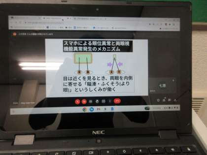12月16日(金)第2回学校保健委員会 公開日 2022/12/16 更新日 2022/12/16 今日の西中 第2回学校保健委員会がmeetを用いて行われました。今回は「生活習慣を見直そう〜メディアとの付き合い方について〜」をテーマに、西中生の実態やメディアが体に及ぼす様々な影響など、保健委員が説明してくれました。メディア長時間視聴の健康被害についても、わかりやすく伝えてもらいました。今後の生活に生かしていけることと思います。