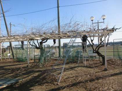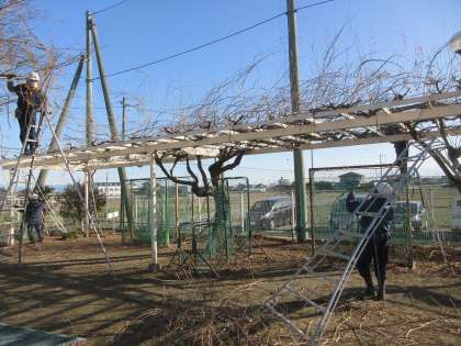 1月17日(火)藤棚剪定 公開日 2023/01/18 更新日 2023/01/18 今日の西中 西ドリームネット(市藤友会のメンバー)4名の方に、藤棚の剪定をしていただきました。校庭東にある藤棚は、なかなか花が咲かず、ボランティアの方に気にかけていただき手入れをしてもらっています。2時間ほどで剪定の作業は修了しましたが、藤棚のある場所が水気のない場所らしく花芽がなかなかできにくいとのことでした。綺麗な花が咲くことを期待しています。