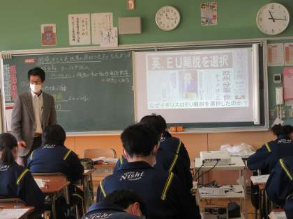 1月18日(水)授業の様子(3年1組社会) 公開日 2023/01/18 更新日 2023/01/18 今日の西中 世界の地域主義の動きについて考えました。具体的に最も速く地域的な国際協力の体制を整えた、ヨーロッパ連合を取り上げ、特徴について整理をしました。最後に、イギリスがEU脱退を選んだ理由について資料を通して考察しました。皆、集中して資料を読み取っていました。