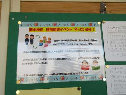 2月 9日(木)校区連携図書イベント 公開日 2023/02/09 更新日 2023/02/09 今日の西中 西中校区4校が連携して図書イベントを行っています。その内容は、西中の図書委員が小学生に向けてオススメ本を選び、紹介するというものです。 本を読んだ日野小の児童から感想が届きました。図書室前に感想が貼ってありますので、読んでみてください。