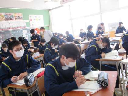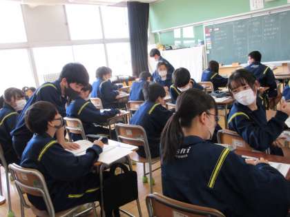 3月15日(水)授業の様子(1年1組数学) 公開日 2023/03/15 更新日 2023/03/15 今日の西中 度数分布表からおよその平均値を求める問題に取り組みました。各自で問題を解いた後は、友達同士で確かめ合いました。