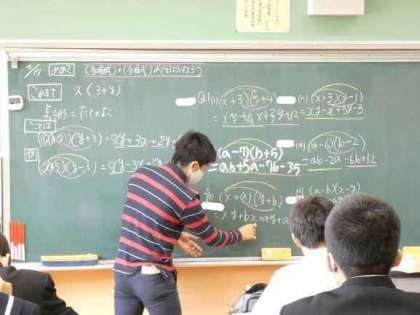 4月17日(月)授業の様子(3年1組 数学) 公開日 2023/04/17 更新日 2023/04/17 今日の西中 3年生の数学は、多項式どうしの乗法の授業です。 前時の授業で学んだ解き方を活用して、いろいろな問題に取り組んでいました。 少しずつ難易度が上がっていきましたが、積極的に発言し、自信をもって勉強していました。