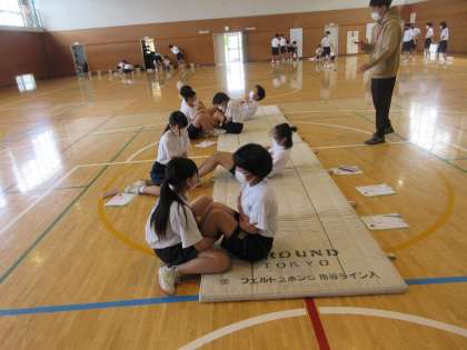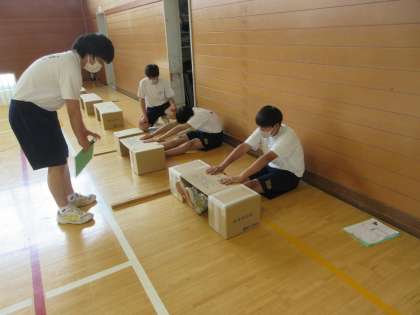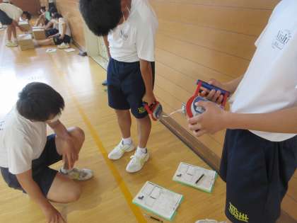 体育は、体育館で体力テストです。昨年の記録を念頭において、更なる記録向上を目指しました。体の成長とともに、1年間で体力も向上していることを実感していました。