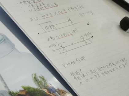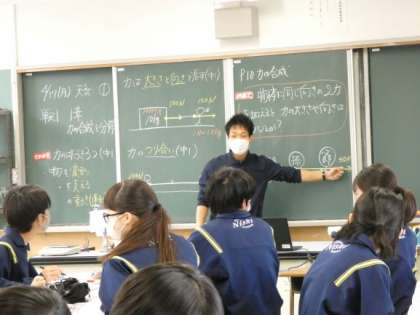 4月17日(月)授業の様子(3年2組 理科) 公開日 2023/04/17 更新日 2023/04/17 今日の西中 3年生の理科は、力の合成の授業です。 今日のめあては、2つの力を同じ方向や反対の方向に加えた場合、力の向きや大きさはどうなるか、というものでした。 ひき算やたし算で求められることがわかりました。 では、斜めに加えたらどうなる? どうやったら求められるのだろう?? この次の理科の授業が楽しみになる課題が示されました。