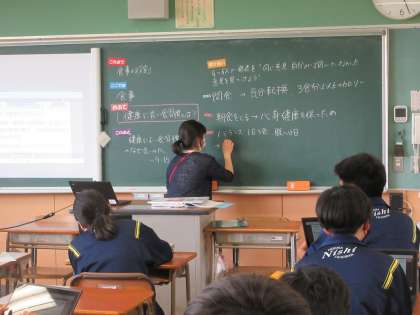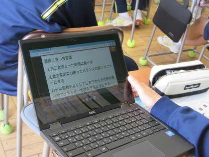 「健康に良い食習慣」について考えています。「良い」理由を考えながら、タブレットPCを用いて意見交流を行いました。