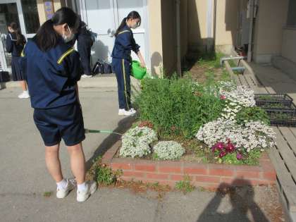 4月21日(金)朝の活動 公開日 2023/04/21 更新日 2023/04/21 今日の西中 あいさつ運動は、2年1組が当番でした。元気で爽やかなあいさつで、登校する生徒を迎えていました。あいさつ運動の横では、園芸委員の生徒が、活動していました。