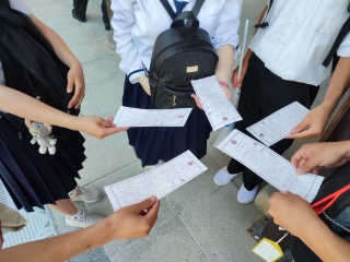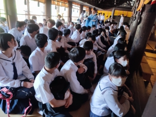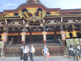 1組、2組の最初の見学地は学問の神様菅原道真公をお祀りした北野天満宮