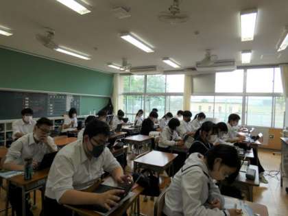 タブレットを活用して、真剣に考えながら取り組んでいました。