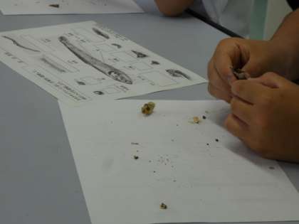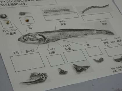 一人に一匹のカタクチイワシが配られ、からだのつくりを調べていました。