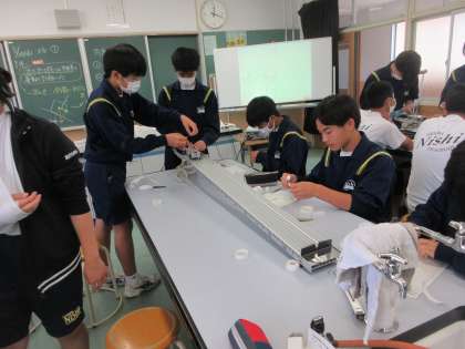 5月24日(水)授業の様子(3年3組 理科) 公開日 2023/05/24 更新日 2023/05/24 今日の西中 運動の様子を、記録タイマーを用いて確認しました。斜面の角度が違うと、運動はどのように変化するのか、運動の記録から考察します。