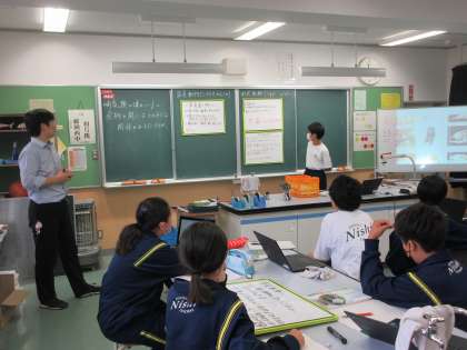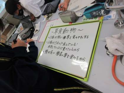6月2日(金)授業の様子(1年3組 理科) 公開日 2023/06/02 更新日 2023/06/02 今日の西中 草食動物と肉食動物の体のつくりの特徴を班ごとにまとめ、発表し合いました。各班、食物と関係づけながらまとめることができました。