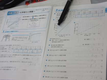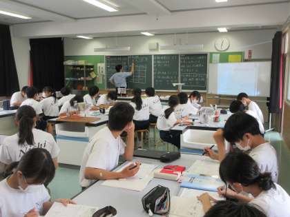 6月12日(月)授業の様子(2年1組 理科) 公開日 2023/06/12 更新日 2023/06/12 今日の西中 これまで化学変化では、反応する物質の質量の割合が決まっていることを学習してきました。今日は化合比から、反応する物質や化合物の質量を計算でもとめました。数学の復習をしながら、問題を解いていました。