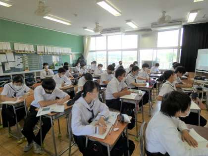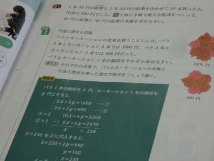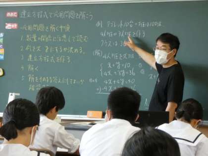 6月13日(火)授業の様子(2年2組 数学) 公開日 2023/06/13 更新日 2023/06/13 今日の西中 2年生の数学は、連立方程式の授業です。 問題文によっては、連立方程式を用いることで解けるものがあることが分かりました。 xとyを決めて、式を立て、学んだことを生かして解いていました。