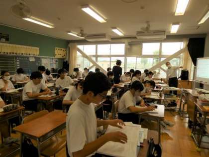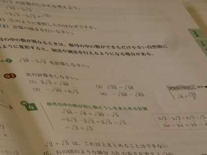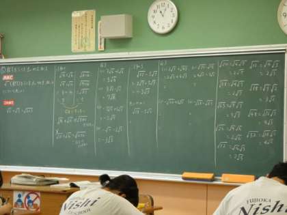 6月14日(水)授業の様子(3年2組 数学) 公開日 2023/06/14 更新日 2023/06/14 今日の西中 3年生の数学は、根号をふくむ式の加法、減法の授業です。 根号の中を工夫することで、計算ができる場合があることが分かりました。 これ以上まとめられるかどうかを意識して、計算問題に取り組んでいました。