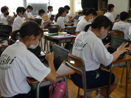タブレットを使って、友達全員のスピーチを聞き、感想や友達のよさなどを記録していました。もう一度聞きたいときは、再生することができ、効果的な活用方法です。