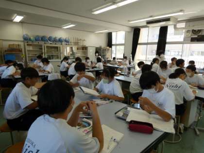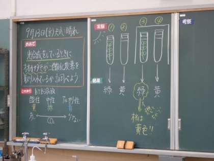 9月13日(水)授業の様子(2年3組 理科) 公開日 2023/09/13 更新日 2023/09/13 今日の西中 2年生の理科では、光合成で二酸化炭素を取り入れているかどうか、実験結果を元に考察しました。 BTB溶液を使うことで、一目瞭然に色の変化が見られました。 光を完全に遮ることが難しかった班もあったようですが、原因を考えるなど、科学的に考える姿が見られました。