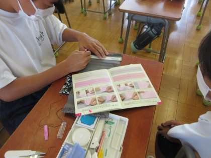 ポケットティッシュカバーを手縫いで製作しています。まち針を打ち、様々な縫い方で形を整えていきます。この後、ボタン、スナップを付けます。慎重に作業を進めていました。