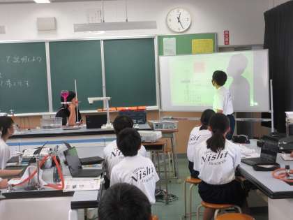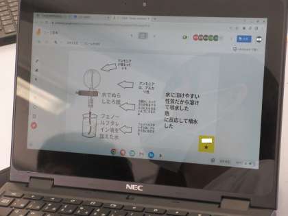 9月15日(金)授業の様子(1年2組 理科) 公開日 2023/09/15 更新日 2023/09/15 今日の西中 アンモニアの噴水実験を行いました。水が吸い上げられる仕組みを班で考えました。最後に、クラス全体で、意見交流を行い、考えを共有しました。各班、アンモニアの性質をよく理解して、噴水実験の仕組みを説明することができていました。