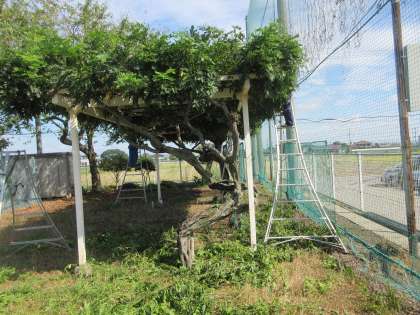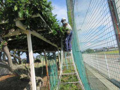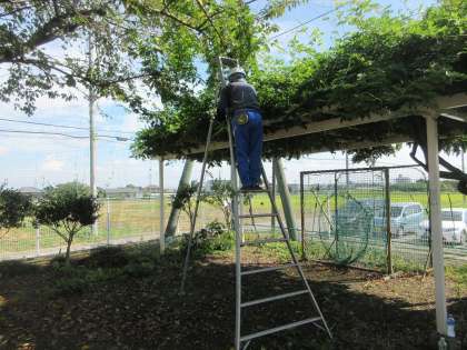 9月19日(火)藤棚の剪定 公開日 2023/09/19 更新日 2023/09/19 今日の西中 西ドリームネット(市藤友会のメンバー)2名の方に、藤棚の剪定をしていただきました。校庭東にある藤棚は、なかなか花が咲かず、ボランティアの方に気にかけていただき手入れをしてもらっています。1時間半ほどで剪定の作業は修了しました。次は冬に剪定をして頂く予定です。暑い中、ありがとうございました。綺麗な花が咲くことを期待しています。