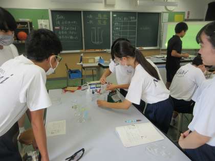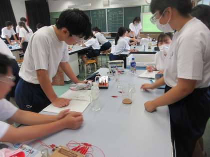 9月28日(木)授業の様子(3年2組 理科) 公開日 2023/09/28 更新日 2023/09/28 今日の西中 様々な水溶液について、電流が流れるかどうか調べました。教科担当が用意した水溶液以外にも、調べてみたい水溶液を家庭から持参し、実験・確認していました。