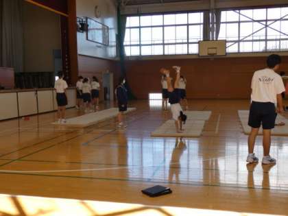10月6日(金)授業の様子(3年2組 体育) 公開日 2023/10/06 更新日 2023/10/06 今日の西中 3年生の体育は、体操です。 連続技に挑戦しています。 動画を撮って見直したり、先生からアドバイスをもらったりしています。 友達同士で、励まし合いながら、熱心に練習していました。