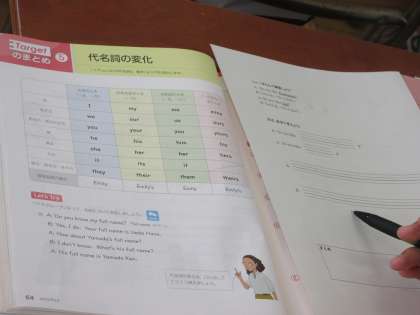 I や you などの代名詞は、働きによって形が変化することを学んでいます。声に出して、しっかり変化を身に付けていました。