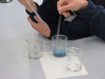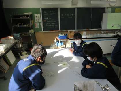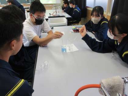 11月16日(木)授業の様子(3年3組 理科) 公開日 2023/11/16 更新日 2023/11/16 今日の西中 酸性の塩酸にアルカリ性の水酸化ナトリウム水溶液を加えると、どんな変化があるか実験しました。BTB溶液の色をみながら、水溶液のなかでどんな変化が起こっているか話し合いました。