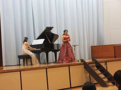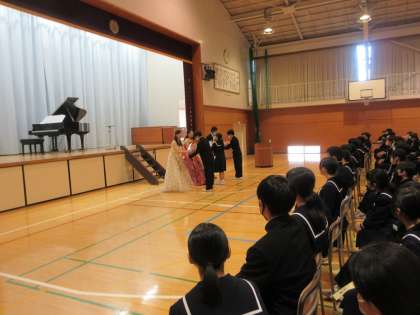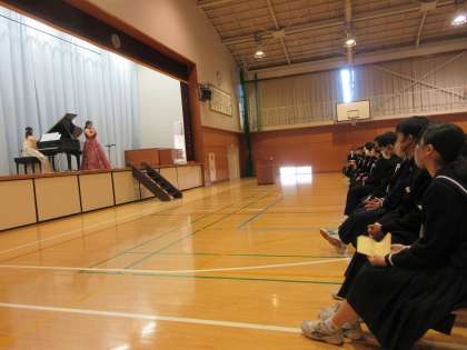 第2部は西中OGである浅見様(ソプラノ)、萩原様(ピアノ)の記念演奏会でした。丁寧に分かりやすく曲の説明をしていただきながら、6曲披露していただきました。美しく迫力ある歌声が体育館いっぱいに響きわたり、生徒は演奏を十分堪能したことと思います。また、自身の経験を踏まえて、在校生にメッセージもいただきました。先輩からの講演会や演奏会は、在校生徒にとって、今後の学校生活の活力となったことかと思います。大変、お世話になりました。