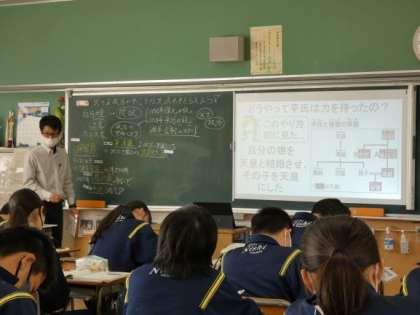 1月18日(木)授業の様子(1年1組 社会) 公開日 2024/01/18 更新日 2024/01/18 今日の西中 1年生の社会は、武士が政治の中心となった流れについて学習しました。 平氏が政権を取るためにとった方策や政権争い、平氏の栄華を経て、源平合戦に至るまで、人物を中心に追うことで、とてもよく理解できたのではないかと思います。 女性の人権についてもよく考えることができました。