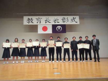 本日、令和5年度藤岡市教育長表彰の表彰式が藤岡市民ホールで行われました。教育長表彰は、文化芸術や体育で顕著な活躍をした児童、生徒、市民に対して教育長が表彰を行うものです。本校からは学芸奨励賞1名、体育奨励賞12名、計13名が受賞しました。それぞれの分野で県NO.1以上の成績をあげた生徒です。緊張しつつも誇らしげな表情で、堂々と表彰をうけました。おめでとうございました。